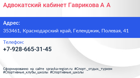 Адвокатский кабинет Гаврикова А.А. по адресу 353461, Краснодарский край, Геленджик, Полевая, 41 в дальнейшем Организация, размещена в следующих категориях: