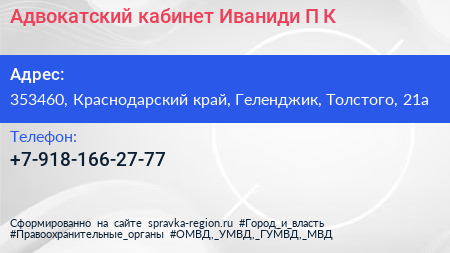 Адвокатский кабинет Иваниди П.К. по адресу 353460, Краснодарский край, Геленджик, Толстого, 21а в дальнейшем Организация, размещена в следующих категориях: