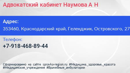 Адвокатский кабинет Наумова А.Н. по адресу 353460, Краснодарский край, Геленджик, Островского, 27 в дальнейшем Организация, размещена в следующих категориях: