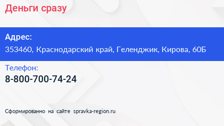 Деньги сразу по адресу 353460, Краснодарский край, Геленджик, Кирова, 60Б в дальнейшем Организация, размещена в следующих категориях: