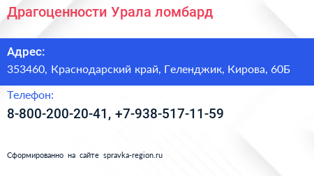Драгоценности Урала, ломбард по адресу 353460, Краснодарский край, Геленджик, Кирова, 60Б в дальнейшем Организация, размещена в следующих категориях: