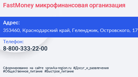 FastMoney, микрофинансовая организация по адресу 353460, Краснодарский край, Геленджик, Островского, 17 в дальнейшем Организация, размещена в следующих категориях: