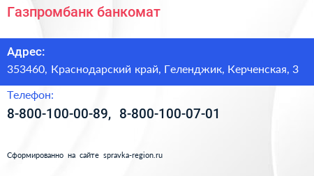 Газпромбанк, банкомат по адресу 353460, Краснодарский край, Геленджик, Керченская, 3 в дальнейшем Организация, размещена в следующих категориях: