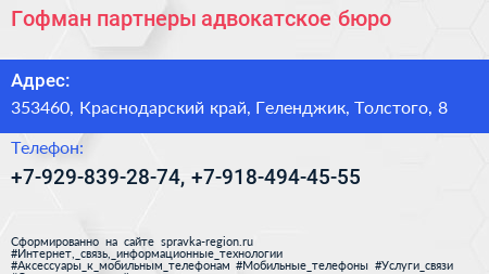 Гофман & партнеры, адвокатское бюро по адресу 353460, Краснодарский край, Геленджик, Толстого, 8 в дальнейшем Организация, размещена в следующих категориях: