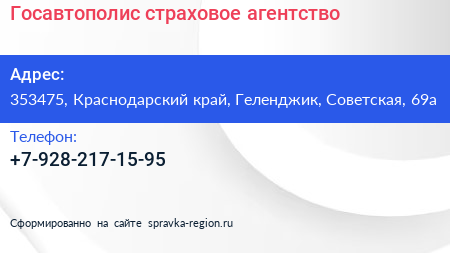 Госавтополис, страховое агентство по адресу 353475, Краснодарский край, Геленджик, Советская, 69а в дальнейшем Организация, размещена в следующих категориях: