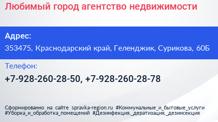 Любимый город, агентство недвижимости по адресу 353475, Краснодарский край, Геленджик, Сурикова, 60Б в дальнейшем Организация, размещена в следующих категориях: