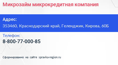 Микрозайм, микрокредитная компания по адресу 353460, Краснодарский край, Геленджик, Кирова, 60Б в дальнейшем Организация, размещена в следующих категориях: