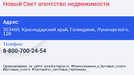 Новый Свет, агентство недвижимости по адресу 353460, Краснодарский край, Геленджик, Луначарского, 128 в дальнейшем Организация, размещена в следующих категориях: