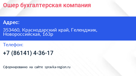 Ошер, бухгалтерская компания по адресу 353460, Краснодарский край, Геленджик, Новороссийская, 163р в дальнейшем Организация, размещена в следующих категориях: