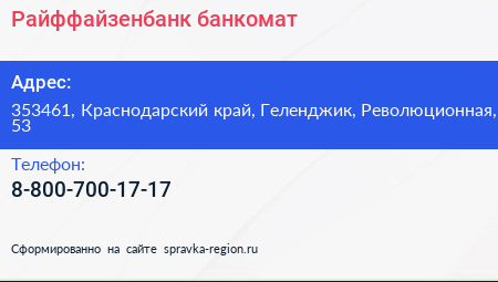 Райффайзенбанк, банкомат по адресу 353461, Краснодарский край, Геленджик, Революционная, 53 в дальнейшем Организация, размещена в следующих категориях: