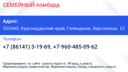 СЕМЕЙНЫЙ, ломбард по адресу 353460, Краснодарский край, Геленджик, Херсонская, 12 в дальнейшем Организация, размещена в следующих категориях: