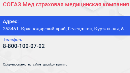 СОГАЗ-Мед, страховая медицинская компания по адресу 353461, Краснодарский край, Геленджик, Курзальная, 6 в дальнейшем Организация, размещена в следующих категориях: