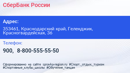 СберБанк России по адресу 353461, Краснодарский край, Геленджик, Красногвардейская, 36 в дальнейшем Организация, размещена в следующих категориях: