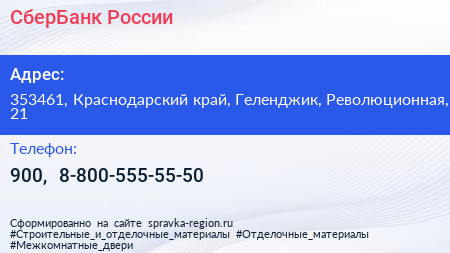 СберБанк России по адресу 353461, Краснодарский край, Геленджик, Революционная, 21 в дальнейшем Организация, размещена в следующих категориях: