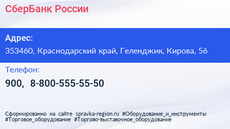 СберБанк России по адресу 353460, Краснодарский край, Геленджик, Кирова, 56 в дальнейшем Организация, размещена в следующих категориях: