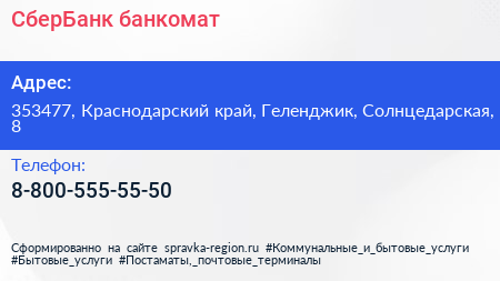 СберБанк, банкомат по адресу 353477, Краснодарский край, Геленджик, Солнцедарская, 8 в дальнейшем Организация, размещена в следующих категориях: