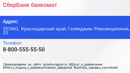 СберБанк, банкомат по адресу 353461, Краснодарский край, Геленджик, Революционная, 21 в дальнейшем Организация, размещена в следующих категориях: