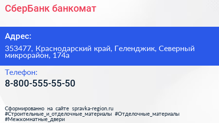 СберБанк, банкомат по адресу 353477, Краснодарский край, Геленджик, Северный микрорайон, 174а в дальнейшем Организация, размещена в следующих категориях: