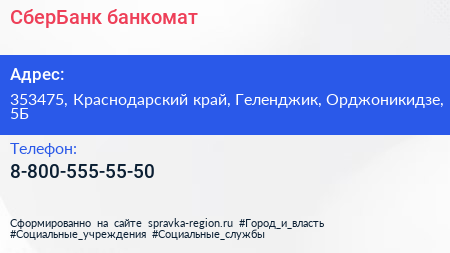 СберБанк, банкомат по адресу 353475, Краснодарский край, Геленджик, Орджоникидзе, 5Б в дальнейшем Организация, размещена в следующих категориях: