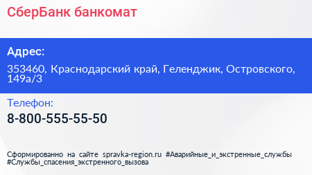 СберБанк, банкомат по адресу 353460, Краснодарский край, Геленджик, Островского, 149а/3 в дальнейшем Организация, размещена в следующих категориях: