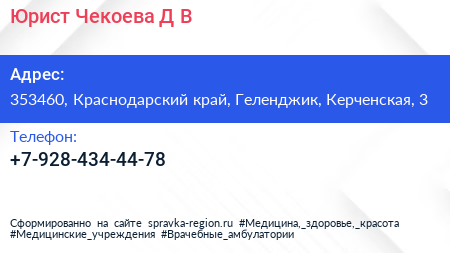 Юрист Чекоева Д.В. по адресу 353460, Краснодарский край, Геленджик, Керченская, 3 в дальнейшем Организация, размещена в следующих категориях: