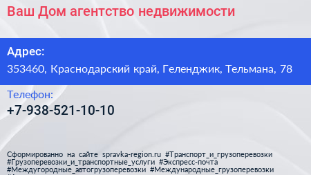 Ваш Дом, агентство недвижимости по адресу 353460, Краснодарский край, Геленджик, Тельмана, 78 в дальнейшем Организация, размещена в следующих категориях: