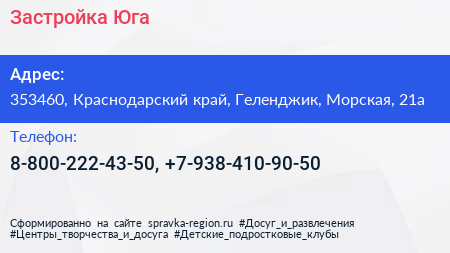 Застройка Юга по адресу 353460, Краснодарский край, Геленджик, Морская, 21а в дальнейшем Организация, размещена в следующих категориях: