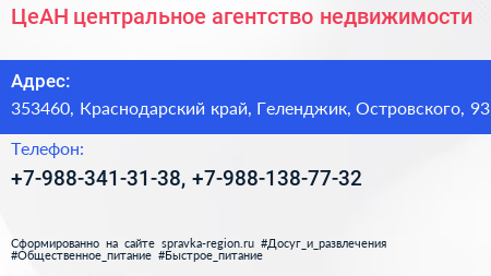 ЦеАН, центральное агентство недвижимости по адресу 353460, Краснодарский край, Геленджик, Островского, 93 в дальнейшем Организация, размещена в следующих категориях: