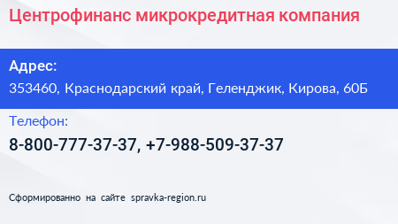Центрофинанс, микрокредитная компания по адресу 353460, Краснодарский край, Геленджик, Кирова, 60Б в дальнейшем Организация, размещена в следующих категориях: