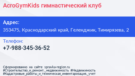 AcroGymKids, гимнастический клуб по адресу 353475, Краснодарский край, Геленджик, Тимирязева, 2 в дальнейшем Организация, размещена в следующих категориях: