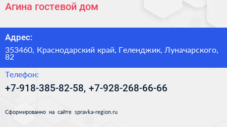 Агина, гостевой дом по адресу 353460, Краснодарский край, Геленджик, Луначарского, 82 в дальнейшем Организация, размещена в следующих категориях: