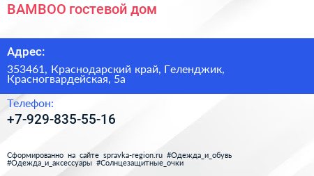 BAMBOO, гостевой дом по адресу 353461, Краснодарский край, Геленджик, Красногвардейская, 5а в дальнейшем Организация, размещена в следующих категориях:
