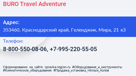 BURO Travel & Adventure по адресу 353460, Краснодарский край, Геленджик, Мира, 21 к3 в дальнейшем Организация, размещена в следующих категориях: