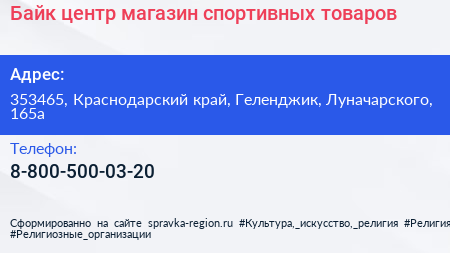 Байк центр, магазин спортивных товаров по адресу 353465, Краснодарский край, Геленджик, Луначарского, 165а в дальнейшем Организация, размещена в следующих категориях: