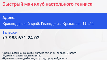 Быстрый мяч, клуб настольного тенниса по адресу Краснодарский край, Геленджик, Крымская, 19 к11 в дальнейшем Организация, размещена в следующих категориях:
