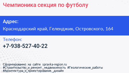 Чемпионика, секция по футболу по адресу Краснодарский край, Геленджик, Островского, 164 в дальнейшем Организация, размещена в следующих категориях: