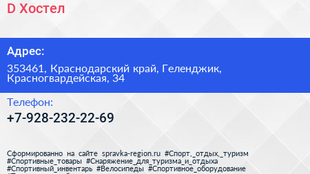 D`Хостел по адресу 353461, Краснодарский край, Геленджик, Красногвардейская, 34 в дальнейшем Организация, размещена в следующих категориях: