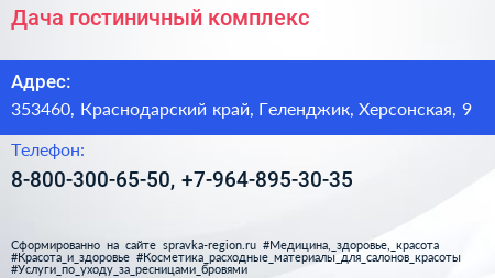 Дача, гостиничный комплекс по адресу 353460, Краснодарский край, Геленджик, Херсонская, 9 в дальнейшем Организация, размещена в следующих категориях: