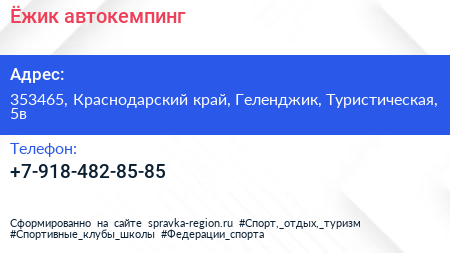 Ёжик, автокемпинг по адресу 353465, Краснодарский край, Геленджик, Туристическая, 5в в дальнейшем Организация, размещена в следующих категориях: