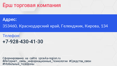Ёрш, торговая компания по адресу 353460, Краснодарский край, Геленджик, Кирова, 134 в дальнейшем Организация, размещена в следующих категориях:
