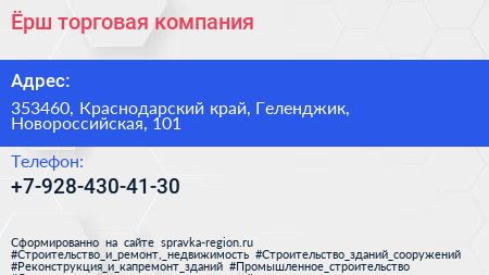 Ёрш, торговая компания по адресу 353460, Краснодарский край, Геленджик, Новороссийская, 101 в дальнейшем Организация, размещена в следующих категориях: