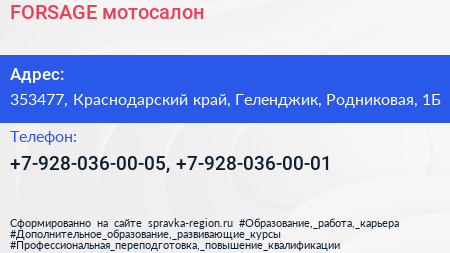 FORSAGE, мотосалон по адресу 353477, Краснодарский край, Геленджик, Родниковая, 1Б в дальнейшем Организация, размещена в следующих категориях: