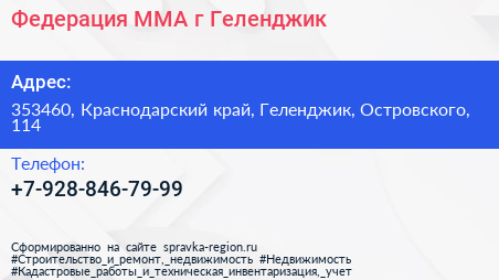 Федерация MMA, г. Геленджик по адресу 353460, Краснодарский край, Геленджик, Островского, 114 в дальнейшем Организация, размещена в следующих категориях: