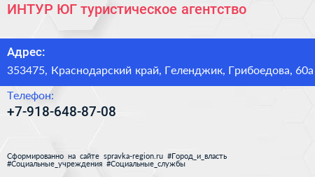 ИНТУР ЮГ, туристическое агентство по адресу 353475, Краснодарский край, Геленджик, Грибоедова, 60а в дальнейшем Организация, размещена в следующих категориях: