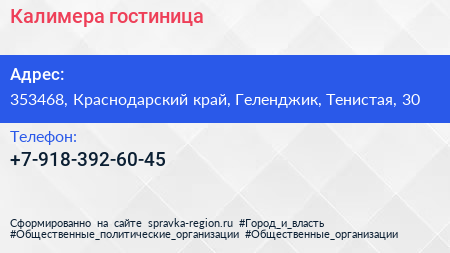 Калимера, гостиница по адресу 353468, Краснодарский край, Геленджик, Тенистая, 30 в дальнейшем Организация, размещена в следующих категориях: