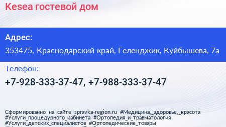 Kesea, гостевой дом по адресу 353475, Краснодарский край, Геленджик, Куйбышева, 7а в дальнейшем Организация, размещена в следующих категориях: