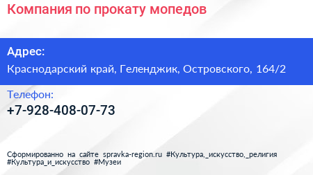 Компания по прокату мопедов по адресу Краснодарский край, Геленджик, Островского, 164/2 в дальнейшем Организация, размещена в следующих категориях: