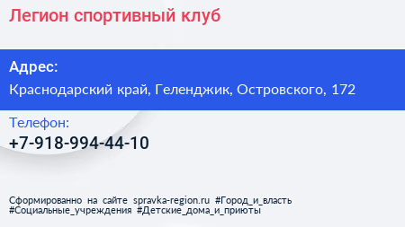 Легион, спортивный клуб по адресу Краснодарский край, Геленджик, Островского, 172 в дальнейшем Организация, размещена в следующих категориях: