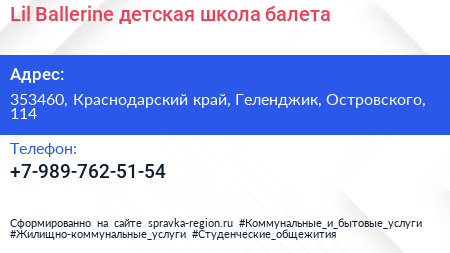 Lil Ballerine, детская школа балета по адресу 353460, Краснодарский край, Геленджик, Островского, 114 в дальнейшем Организация, размещена в следующих категориях: