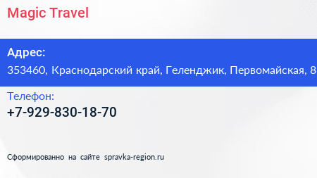 Magic Travel по адресу 353460, Краснодарский край, Геленджик, Первомайская, 8 в дальнейшем Организация, размещена в следующих категориях: